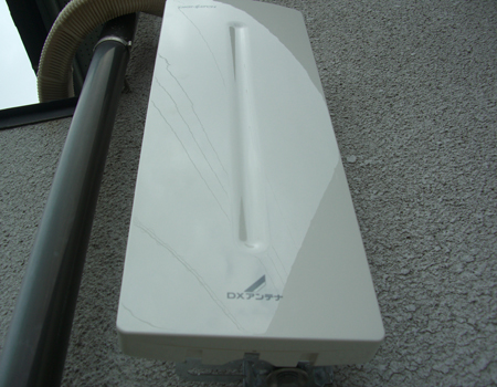 バルコニーに専用の金具を取り付けたらアンテナをセットして方向調整をします。アンテナ線は天井の中から外に出しておきましたのでアンテナのところまで外配線をしてつなぎます。天井の中に取り付けたブースターのレベル調整をしたら工事完了です。