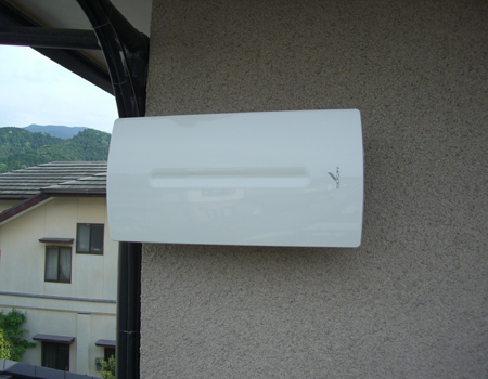 外断熱工法の作りで密閉性を重視しますので取り付けを慎重にします。アンテナ取り付け金物を柱のある所に取り付けコーキングします。後は本体を付け調整をして完了です。ここに来るまでにご主人の手を借りて天井の中を配線したりエアコンカバーを外したりコンセントを外したりいろいろありました。ご協力ありがとうございます。